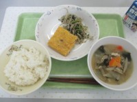 〈メニュー〉・ごはん・お豆腐のすきやき風・かぶのみそ汁・浅漬け・牛乳〈八王子...