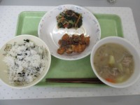 〈メニュー〉・わかめごはん・ほきのごまがらめ・小松菜の和え物・豚汁・牛乳〈八...