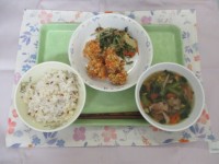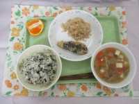 〈メニュー〉・わかめごはん・わかさぎのかりかりあげ・みぞれ汁・ごしきあえ・くだも...