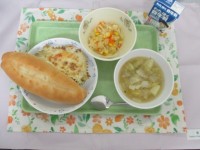 〈メニュー〉・ソフトフランスパン・えびマカロニグラタン・白いんげん豆のスープ・は...