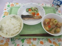 〈メニュー〉・ごまごはん・焼きししゃも・新じゃがのピリ辛煮・野菜のおかか和え・く...