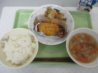 〈メニュー〉・ごはん・あじのもみじ焼き・豚肉ときゃべつのみそ炒め・くずきりス...