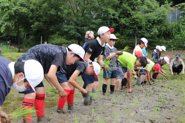 ・稲作体験学習…全校で田植え・草取り・稲刈り、5年生は脱穀