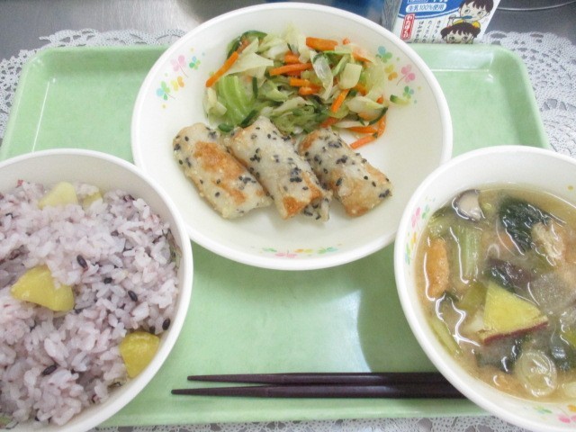 今日は、日本遺産献立の八王子城御膳です。秋月ごはんは、黒米を入れて色づけしたごはんに、甘く煮た栗が入ったごはんです。秋の夜空に浮かぶ美しい月を、黒米と栗で表現しました。八王子城には、敵からの攻撃を防ぐために石垣がありました。石垣揚げは、白ごまと黒ごまを混ぜた衣が石垣のように見えることから、この名前がつけられました。八王汁は、八王子の名前の由来になった八人の王子にちなんで、八王子でとれる八種類の野菜を入れた汁ものです。