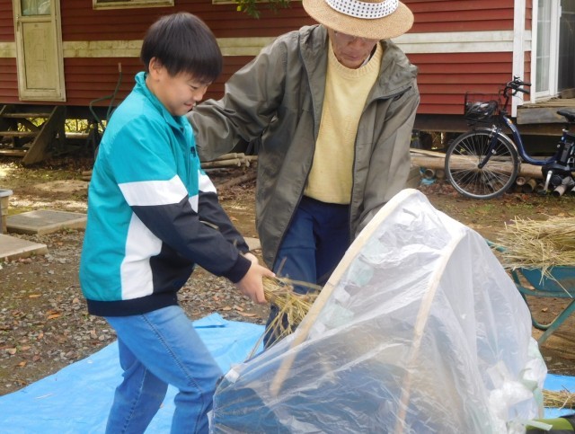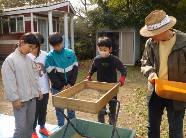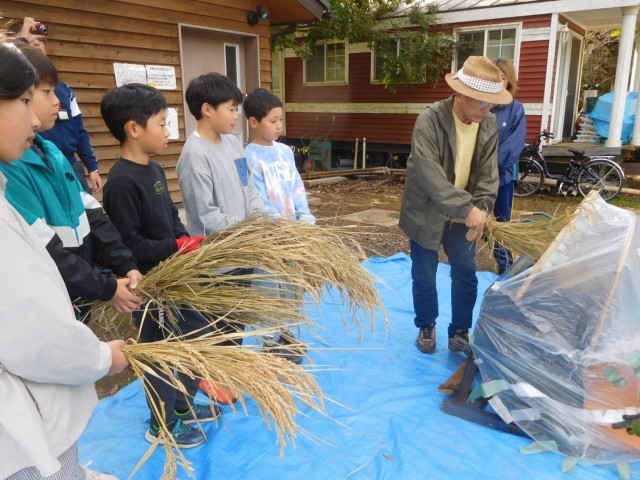 上川の里で育て、稲刈りが終わったものを5年生が脱穀しました。昔ながらの足踏み脱穀機と唐箕を使っての作業です。毎年稲作についてご指南いただいている浅賀さんに教わりながら、刈って天日干しにしていた稲束を脱穀しました。足踏み脱穀機は子ども達が楽しんでできた様子で、「もっとやりたい」の声が聞こえてきました。