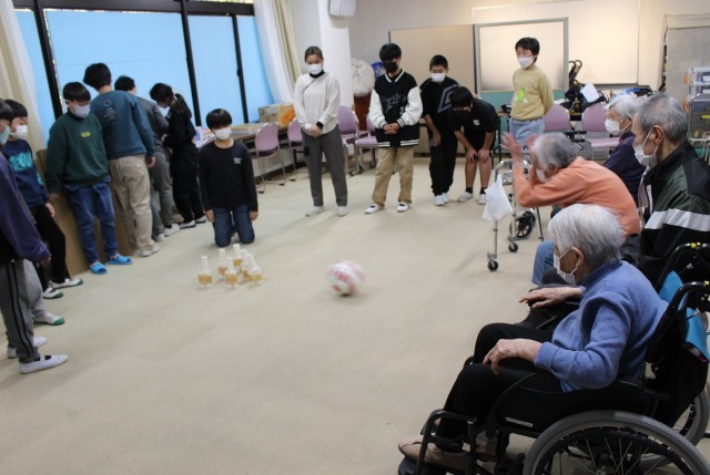 5・6年生は、総合的な学習の時間に介護老人保健施設「ウエストケアセンター」に行きました。地域にある施設のご協力をいただきながら高齢者について知り、共生社会について理解をしていくことをねらいます。今回の訪問では、施設に来所している高齢者の方々とふれあえるよう児童が考えた「ボーリング」遊びを準備していきました。
