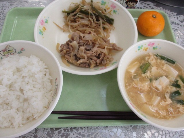 ★もやしと茎わかめのピリ辛炒め ★にらたまみそ汁 ★みかん ★牛乳
