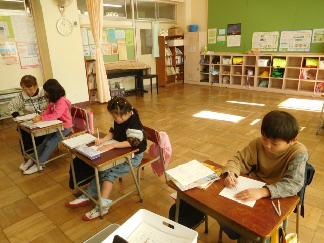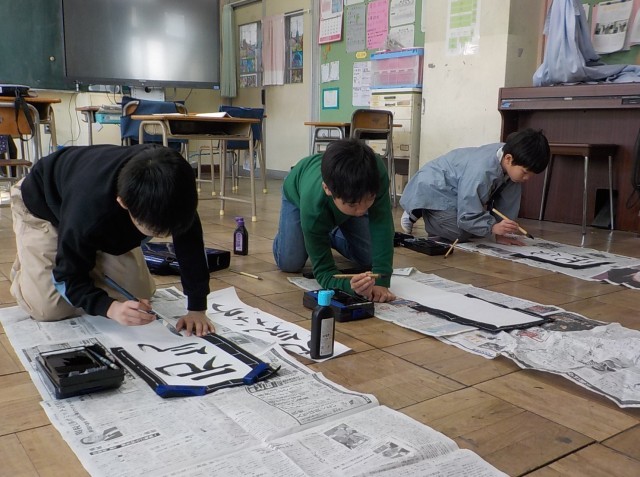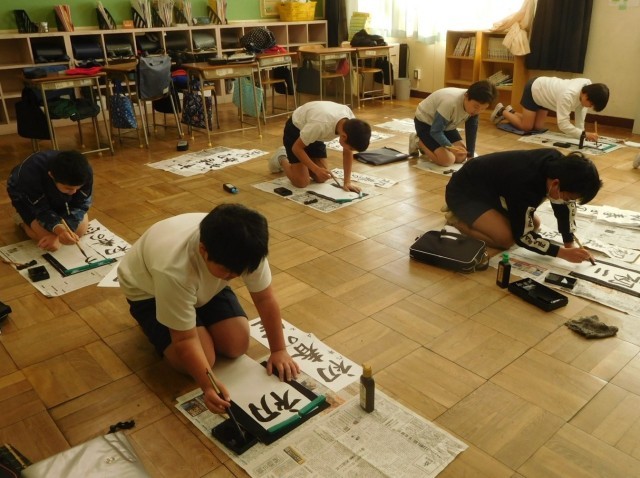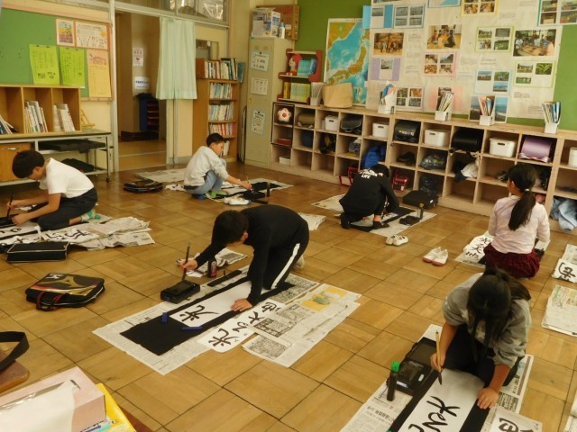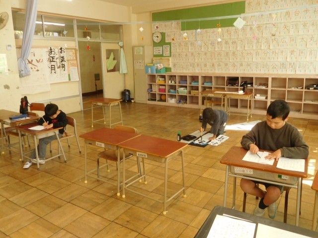 校内書き初め展(1月19日から30日に実施)に向けて、各学年で書き初めの授業が行われました。子ども達は姿勢を正して書くことに集中し、一枚清書を書き終えると、大きく息を吐いて緊張感をほぐしていました。間違えないで書けたこと、前よりも上手に書けたことに満足そうでした。