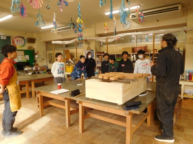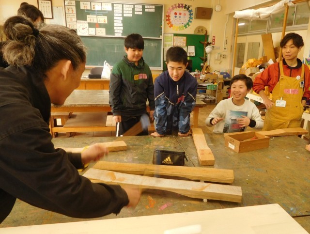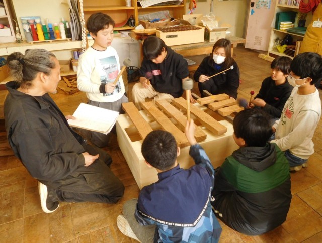 6年生は昨年度伐採した校門横の桜の廃材を使って、木琴作りを行っています。この授業の講師は、先月上川口小で演奏会を行い、自ら楽器制作も行う永井さんです。