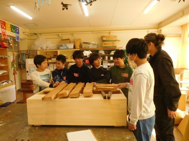 22日(木)の授業では、一人一枚(一音)の板をやすりでみがいて仕上げました。自分の板であることを意識できるように名前を書いてできあがりです。次に、自分の板のいい音が出る場所を見つけてみました。木の粉を板全体にまいて板を叩くと、不思議なことに木の粉が二か所に集まってきます。そこがいい音が出る位置なのです。最後に全員で、チャイムの音楽を演奏してみました。いい音を聴いた心地よさ、永井さんとの会話のおもしろさなど、とても楽しい授業でした。