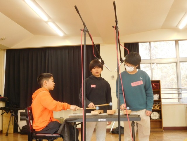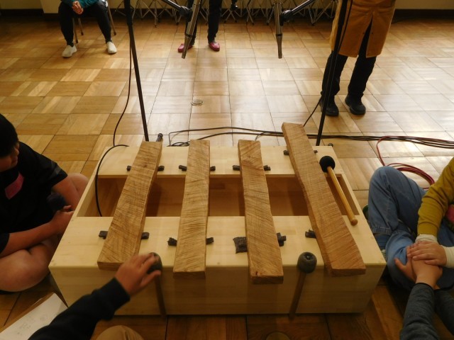 学校の伐採した桜の廃材を活用した授業も今日が最後となりました。廃材を利用して木琴を作りました。その木琴で6年生がチャイムを奏でます。チャイムを演奏する6年生は、何度も演奏しては聞き返し、音色の出し方を少しずつ工夫していました。録音したチャイムの音色は、電子音とはまた違ったぬくもりを感じる響きでした。卒業式、6年生が新たな門出を迎える日に、この新しいチャイムの音色を響かせる予定です。