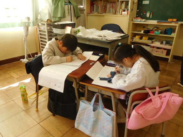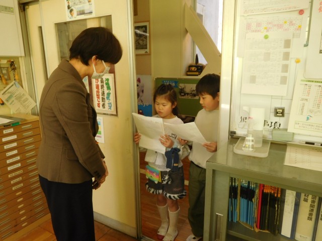 2月4日の国語は、「はじめてしった学校のこと」という授業でした。授業のはじめに二人で職員室にやってきて、副校長先生にインタビューをしました。事前に考えておいた質問をして、先生の答えに対しては「何でですか?」と理由を確かめていました。教室に戻って、インタビューの答えを発表できるように整理しました。