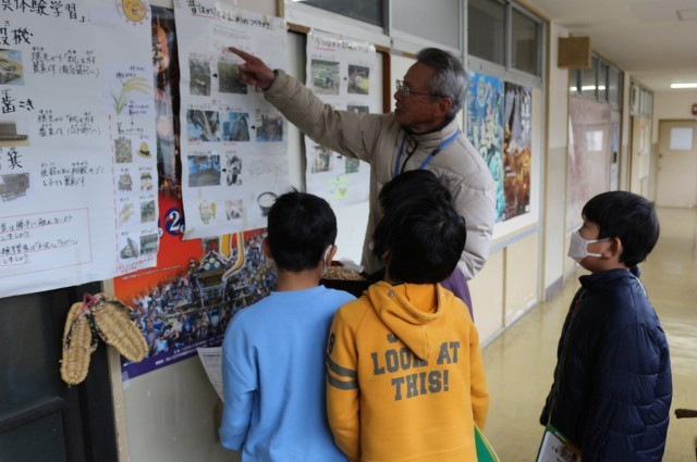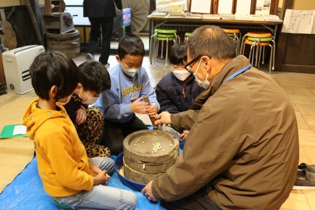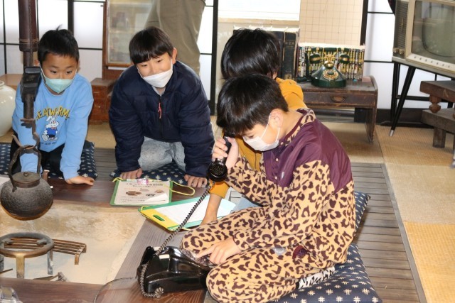 子どもたちは囲炉裏を囲んで座り、学習室の方の話を聴きました。お米を千歯こき・脱穀機を使って脱穀したり、豆を石臼で挽いたり、昔の生活は今のように便利ではありません。他にも、炭で熱を出す炭火アイロン、ダイヤルを回して使う黒電話、ハエを取るためのガラス製のビンなどが展示されていて、初めて見る珍しいものばかりでした。
