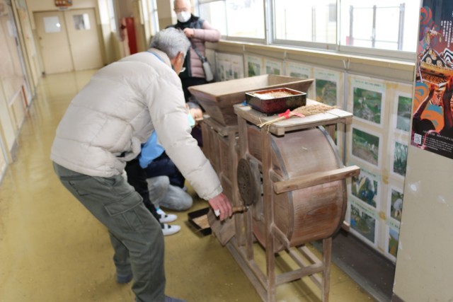 3年生は美山小と合同で、川口中学校のふるさと学習室を訪問し、昔の人が使っていた道具を使って昔の暮らしを体験しました。