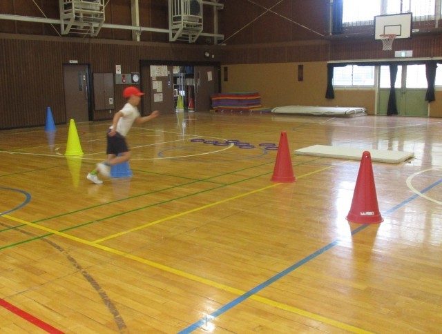 腕立て姿勢で前に進んだり、足を広げてカニ歩きをしたりする運動では、競争しながら楽しそうでした。マット、輪、コーン、ボールを使って少しずつ難しい動きを取り入れていくと、「次はどんなステージだろう。めっちゃ楽しい」という声が聞こえました。