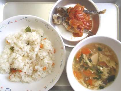今日の献立 ・ガーリックピラフ ・鯵のトマトソースかけ ・野菜と卵のスープ ・牛乳