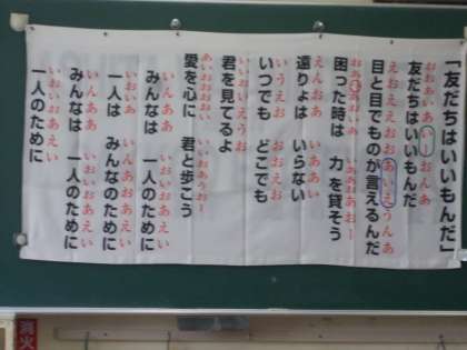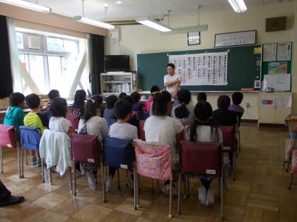 4・5・6年生を対象に、劇団四季の俳優を迎えて、「美しい日本語の話し方教室」を開催しました。日本語の話し言葉をきちんと話すためには、「あ・い・う・え・お」の五つの母音をきちんと話すことが大切だと教えてもらいました。特にあ(A)の母音を一番多く使うことも日本語の特徴なので、「あ」の母音は注意することが必要とのことです。例として次の文章で練習してみました。「 ASHITA WA AMEDAKEDO GAKKOO E ITTEMIYOO」(明日 は 雨だけど 学校 へ 行ってみよう)最後に、 歌「友だちはいいもんだ」を母音のみで歌ったあと子音も入れて歌いました。はっきりとした日本語で歌っていました。