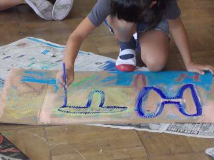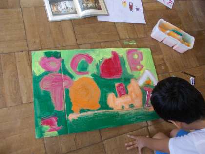 ダンボールに、学習したローマ字を使ってデザインを考え、アクリルで色をつけています。画用紙とは違い、紙質による筆の感覚の違いやダンボールの大きさに応じた表現の違いを学んでいます。大胆な表現をねらっています。