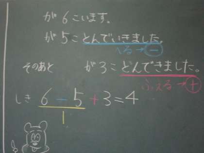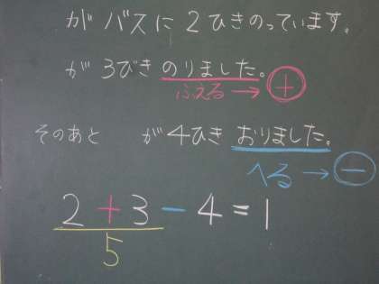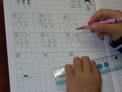1年生・2年生の算数の時間です。1年生はどんなときにたすのかな?、ひくのかな? を考えました。2年生は繰り上がりのたし算をしています。十進法(位)を理解しないとできません。低学年ではマス目のノートを使うので、位取りがしっかりできます。家でもいろいろな表現をして、たすのか、ひくのかを考えてみると良いでしょう。定規を使って線を入れています。中学年、高学年の様々な学習につながっていきますし、計算を丁寧にすることにもつながります。すごく大切なことです。