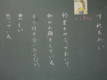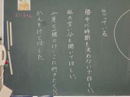 それぞれの日記からそれぞれの心の動きを見つめてみました。子供たちがまず自分のとらえ方をまとめた後、グループで話し合いをしました。なかなか話し合いが進まず静かな時間がたちました。
