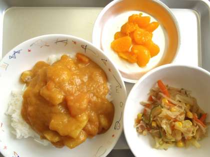 今日の献立 ・カレーライス ・中華風サラダ ・みかん缶 ・牛乳