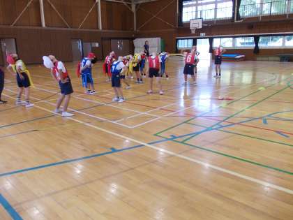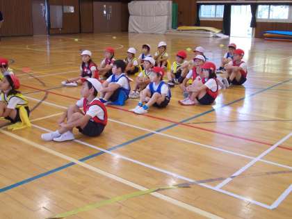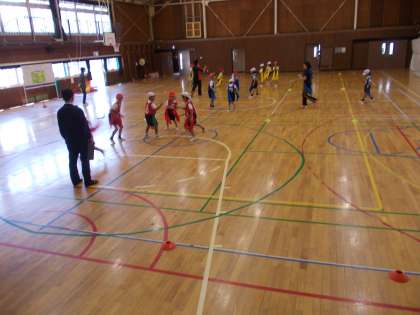 まず集合しました。点を取りやすくするためのルールの工夫を考えさせました。子供から「コートを広くする」と言うことが出されクラスのコートが決まりました。大切なゲーム領域での学習展開です。次に準備運動で運動できる(する)体にしました。曲げるところ、伸ばすところ、回すところ一つ一つの運動をしっかりさせることが大切です。今日特に使う部位をしっかり補助的に動かしたり、動きの感覚をつかませたりする事も必要です。今日は、片足スキーの動きとミニゲーム「じゃんけんしっぽ取り」をし素早い動きの感覚をもたせました。動きについて子供の言葉で「フェイントする」等がでてきました。このように工夫した動きを話させ、今日のねらいへ繋がる動きをおさえました。教師の方からは「大きく逃げる」「距離をおいて逃げる」というポイントを知らせました。