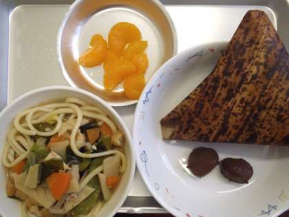 今日の献立 ・若竹うどん ・中華ちまき ・玉こんにゃくの土佐煮 ・みかん缶 ・牛乳
