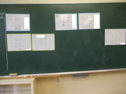 授業の様子1 公開日 2016/05/11 更新日 2016/05/11 全校の様子 2年生算数 2けたの引き算をしています。一人一人がまず考え、ホワイトボードを活用して全員に解かせる工夫をしています。 くり下がりのある計算になると、数の仕組みが理解されていないと理解に時間がかかります。お家でも数を数えたり操作をさせるお手伝いをさせると理解が深まります。 いいね(0)