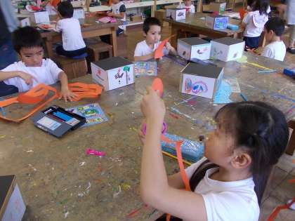 子ども獅子で使う用具を作成しています。はさみをきように使っていました。