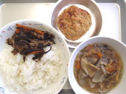 今日の献立 ・ご飯 ・鯵のさんが焼き ・長ひじきの炒め煮 ・沢煮椀 ・牛乳