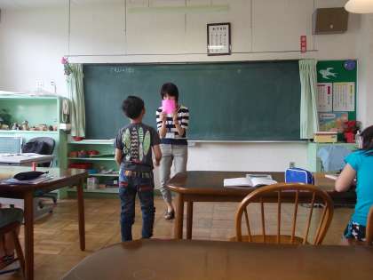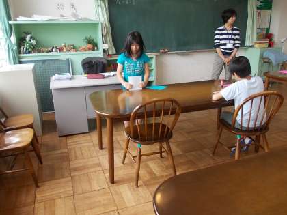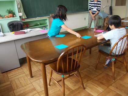 既習のわり算を振り返りました。12枚÷3人 実際に折り紙を用意し操作することで、わり算の意味を再確認しました。子供たちもしばらく考えましたがすぐに分ける枚数が分かりました。24枚÷3人も同じように考えさせ、九九で導き出せる計算を理解した上で80枚÷4人の問題を与えました。