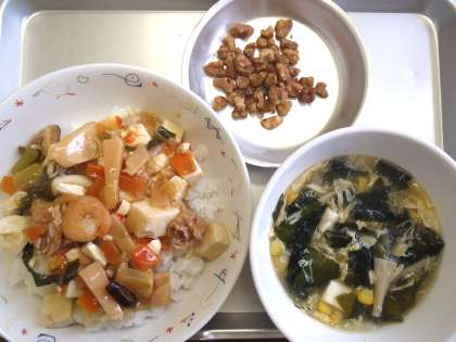 今日の献立 ・海鮮豆腐丼 ・わかめと卵のスープ ・くるみ黒糖 ・牛乳