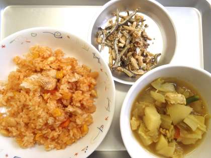 今日の献立 ・大豆ピラフ ・野菜のカレースープ煮 ・手作り魚ナッツ ・牛乳