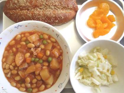 今日の献立 ・セサミトースト ・ポークビーンズ ・コールスロー ・みかん缶 ・牛乳