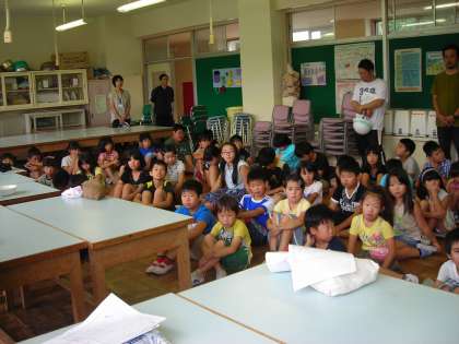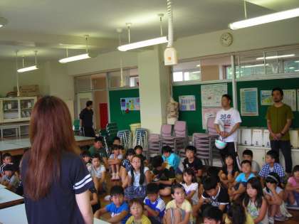 学校長の講話の後、担当者から1学期の避難訓練の振り返りを行い避難時の約束をおさえました。