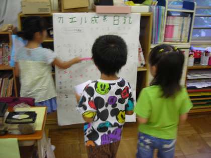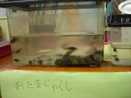 1年生を迎えて飼ってきた生き物について、食べ物 飼い方 特徴 を発表したり クイズで分からせたり 触らせたり 写真で見せたり 図で表したり して伝えていました。