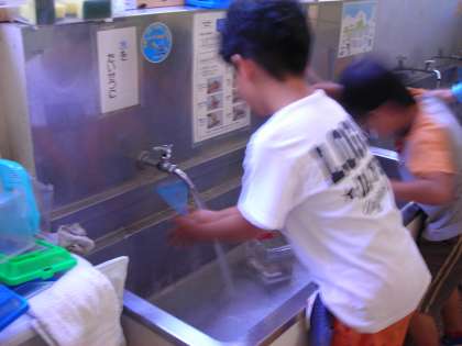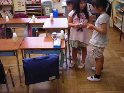 手洗い 白衣 机上を拭く 配膳台を拭く 運ぶ 並ぶ 配膳する 牛乳を配る