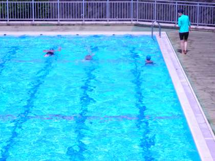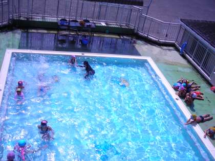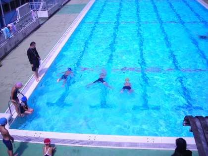 プールの横を泳ぐ。 25メートルを泳ぐ。みんな一生懸命でした。