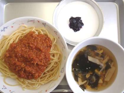 9月6日(火) 本日の給食 公開日 2016/09/06 更新日 2016/09/06 給食室より 今日の献立 ・スパゲティーミートソース ・わかめスープ ・ヨーグルトのブルーベリーソースかけ ・牛乳 いいね(0)
