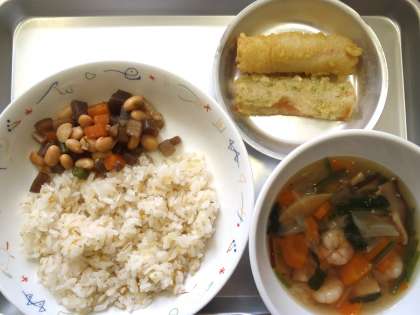今日の献立 ・五穀ご飯 ・ちくわの二色揚げ ・五目煮豆 ・八宝汁 ・牛乳