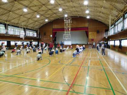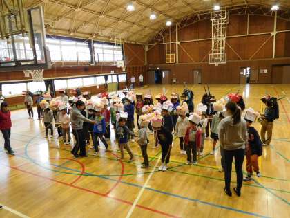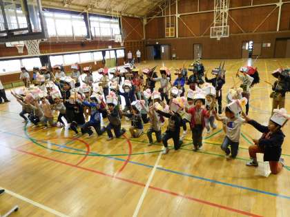6年生を送る会で踊る「子ども獅子」を全員でそろえてみました。