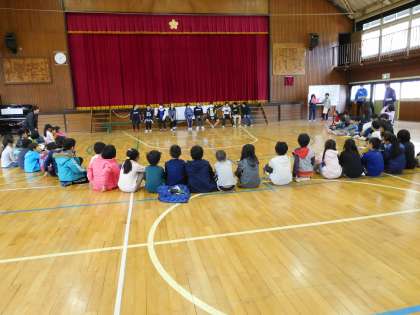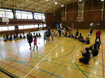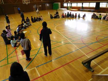 給食に引き続いて6年生を送る会です。 6年生を迎え入れます。 1年生が手を繋いで入場です。