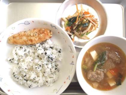 今日の献立 ・わかめご飯 ・笹かまぼこの南部揚げ ・女川汁 ・野菜の彩り和え ・牛乳