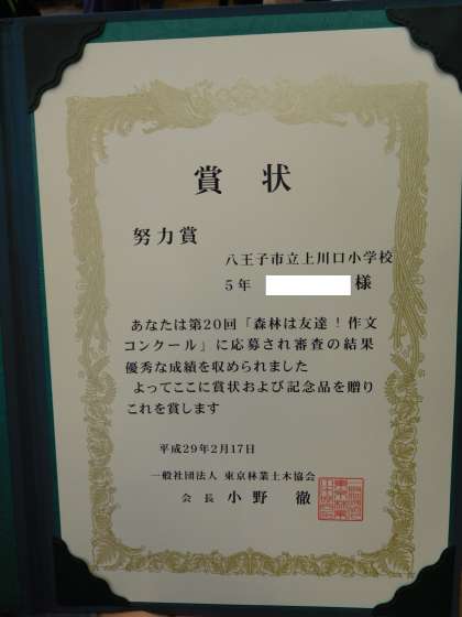 昨年度「森林は友だち!作文コンクール」へ応募し受賞した6年生児童へ 表彰状が贈られました。
