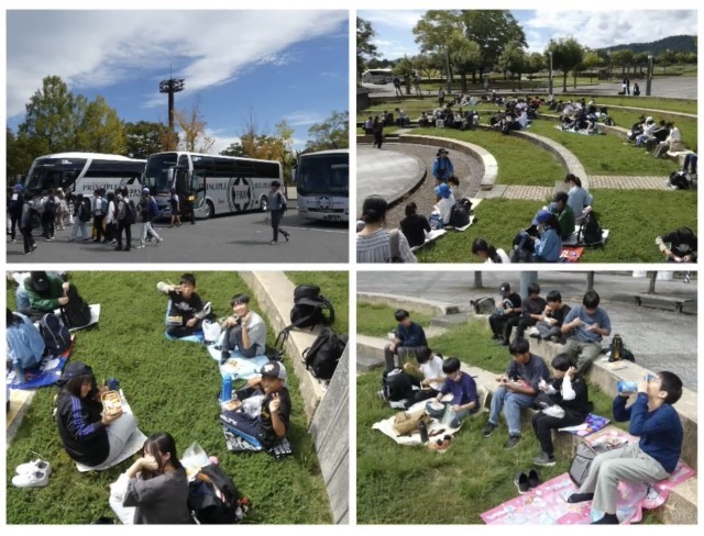 途中2度のトイレ休憩を経て中央自動車道を飯田インターチェンジで降り、予定よりやや早く昼食場所の飯田運動公園に到着しました。