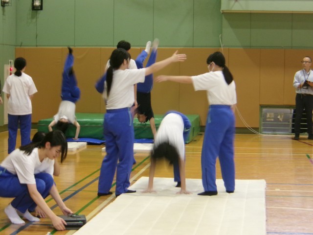 生徒たちは、個人で練習を通して、各自の倒立前転を成立させるための課題を見付け、グループでアドバイスを出し合いながら、自己の課題解決に向けて対策を考えていました。また、学習者用端末を活用して倒立前転の映像を撮影して見返したり、グループ内で補助をつけたり、体育館内に用意された様々な大きさや材質のマットや用具を使ったりして、倒立前転の技能を高る工夫をしていました。