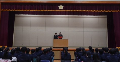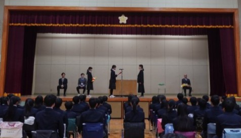 修了式後、生活指導主任が長期休み中に落としてはいけない4点(命、品格、学力、体力)に関すること、この1年間自分を支えてくれた人に感謝の気持ちを自分から伝えるようにしようとのことを話しました。