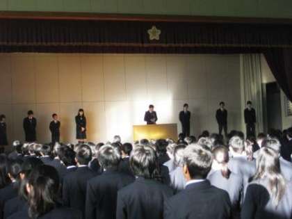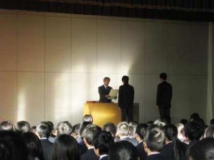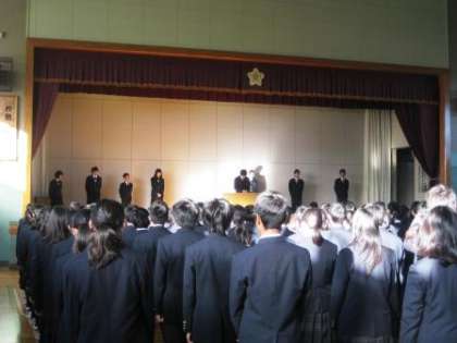 今朝は1月の生徒会朝礼がありました。生徒会長の話、各学年委員長、各専門委員長からそれぞれ報告等がありました。全校生徒の整列もきちんとして立派でした。最後に陸上部の表彰がありました。