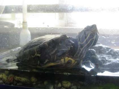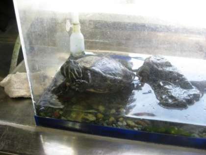 理科室にはいつのころからか水槽にカメを飼うようになりました。今ではこんなに大きくなりました。理科室での授業の時には、カメさんも幾分、興奮気味で、狭い水槽を動き回っています。