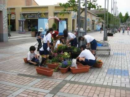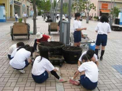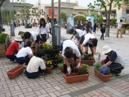 今回、ボランティア部はコンテナガーデンに初参加しました。今日は飾った花の後片付けです。きれいに掃除をしてリアカー4台で運んで帰りました。大変な作業でしたが、たくさんの方に楽しんでいただけてよかったですね。これからも素敵な草花を育ててください。お疲れ様でした。
